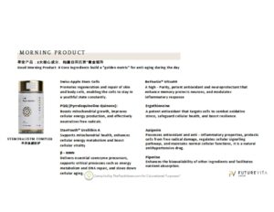 (PhytoCelITec™ Md Nu) Swiss Apple Plant Cell Extract, StanYouth® Urolithin A, BeFisetin® Ultra99, Dr.Ergo® L-(+)-Ergothioneine, NMN (B-Nicotinamide Mononucleotide), PQQ (Pyrroloquinoline Quinone Disodium Salt), Apigenin, Piperine, Vitamin C.